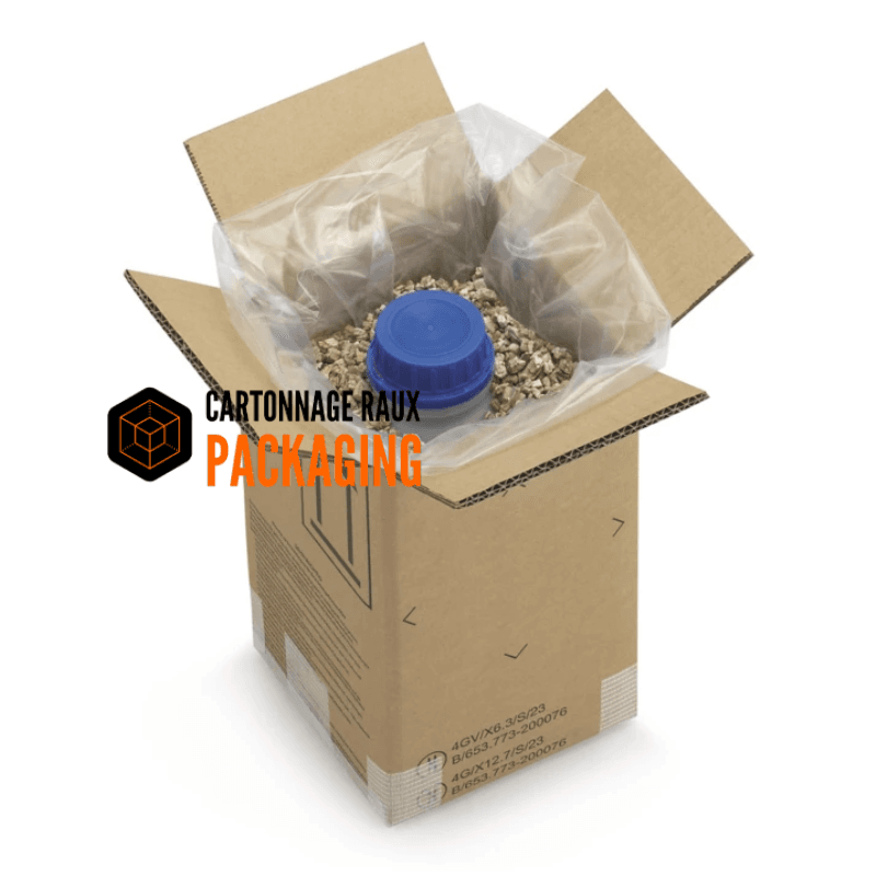 Carton homologué ONU pour le transport des produits dangereux, vendu avec son sac fond de caisse.