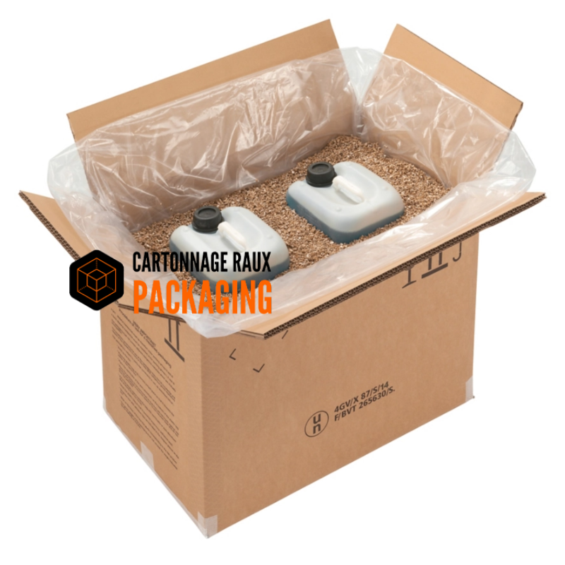 Carton homologué ONU pour le transport des produits dangereux, vendu avec son sac fond de caisse.